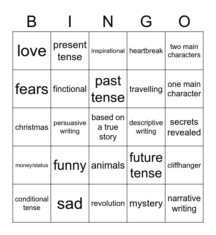 This bingo card has a free space and 24 words: funny, sad, past tense, conditional tense, two main characters, love, fears, present tense, descriptive writing, animals, travelling, christmas, future tense, cliffhanger, finctional, mystery, secrets revealed, inspirational, one main character, persuasive writing, narrative writing, money/status, heartbreak and revolution.