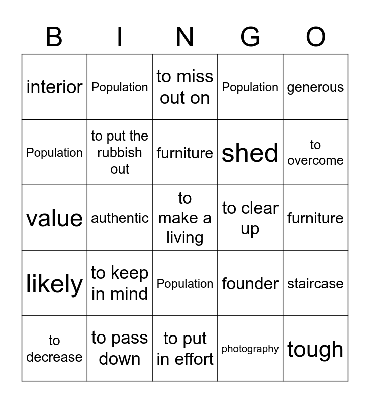 This bingo card has a free space and 29 words: Population, to pass down, to miss out on, pattern, generous, interior, to put the rubbish out, furniture, to clear up, staircase, to decrease, authentic, photography, tough, value, to apply for, to put in effort, founder, to overcome, likely, to keep in mind, self-employed, shed, furniture, Population, Population, Population, Population and Population.