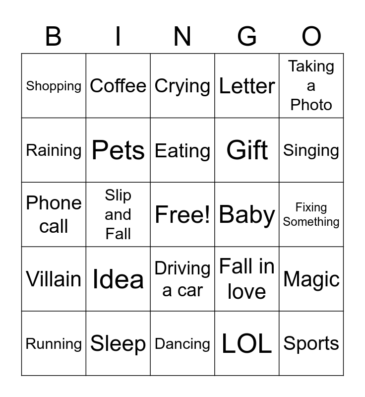 This bingo card has a free space and 24 words: Idea, Sleep, Eating, Running, Taking a Photo, Shopping, Raining, Coffee, Baby, Driving a car, Gift, Phone call, Fall in love, Magic, Pets, LOL, Fixing Something, Crying, Singing, Slip and Fall, Sports, Villain, Letter and Dancing.