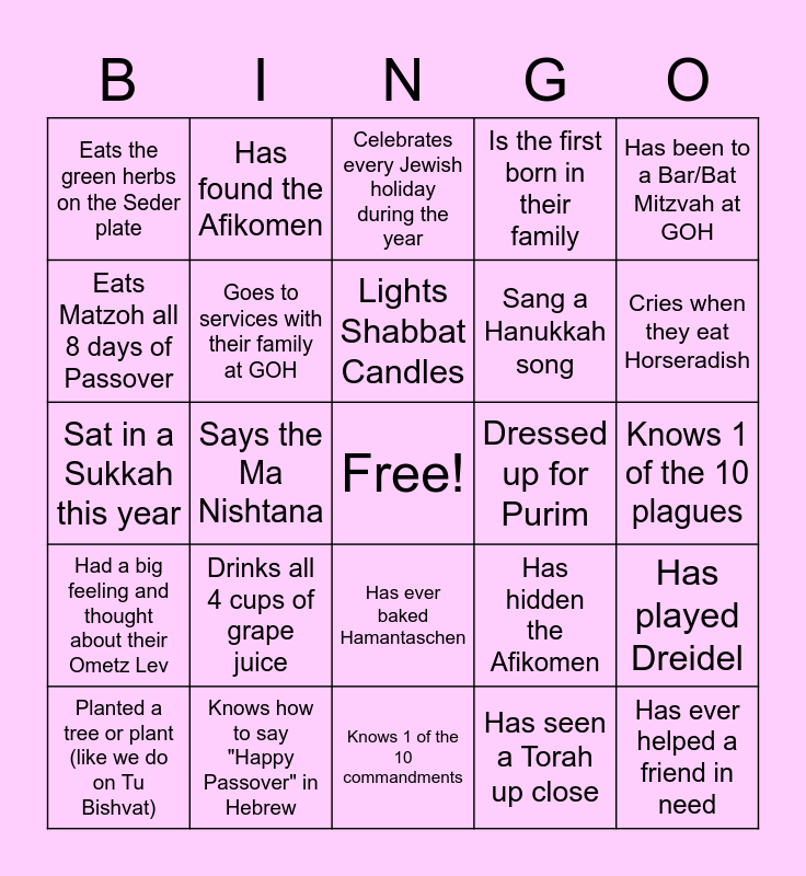 This bingo card has a free space and 27 words: Has hidden the Afikomen, Watches The Prince of Egypt every year, Sang a Hanukkah song, Knows 1 of the 10 commandments, Eats Matzoh all 8 days of Passover, Celebrates every Jewish holiday during the year, Has found the Afikomen, Had a big feeling and thought about their Ometz Lev, Dressed up for Purim, Has played Dreidel, Sat in a Sukkah this year, Is the first born in their family, Planted a tree or plant (like we do on Tu Bishvat), Knows how to say "Happy Passover" in Hebrew, Cries when they eat Horseradish, Has ever been to a Seder, Goes to services with their family at GOH, Lights Shabbat Candles, Drinks all 4 cups of grape juice, Eats the green herbs on the Seder plate, Knows 1 of the 10 plagues, Has seen a Torah up close, Says the Ma Nishtana, Has ever helped a friend in need, Has ever baked Hamantaschen, Has been to a Bar/Bat Mitzvah at GOH and Sings Passover songs.