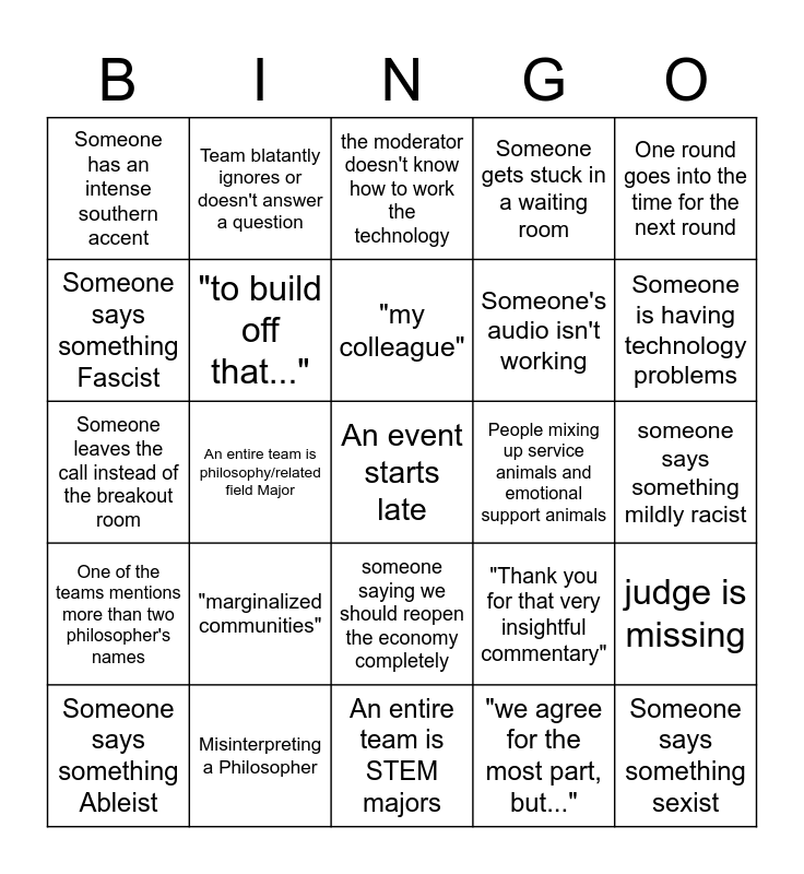 This bingo card has a free space and 24 words: "marginalized communities", Misinterpreting a Philosopher, "my colleague", Someone says something Ableist, One round goes into the time for the next round, Someone has an intense southern accent, Someone says something Fascist, Team blatantly ignores or doesn't answer a question, People mixing up service animals and emotional support animals, someone saying we should reopen the economy completely, Someone's audio isn't working, Someone leaves the call instead of the breakout room, "Thank you for that very insightful commentary", judge is missing, "to build off that...", "we agree for the most part, but...", someone says something mildly racist, the moderator doesn't know how to work the technology, Someone is having technology problems, An entire team is philosophy/related field Major, Someone says something sexist, One of the teams mentions more than two philosopher's names, Someone gets stuck in a waiting room and An entire team is STEM majors.