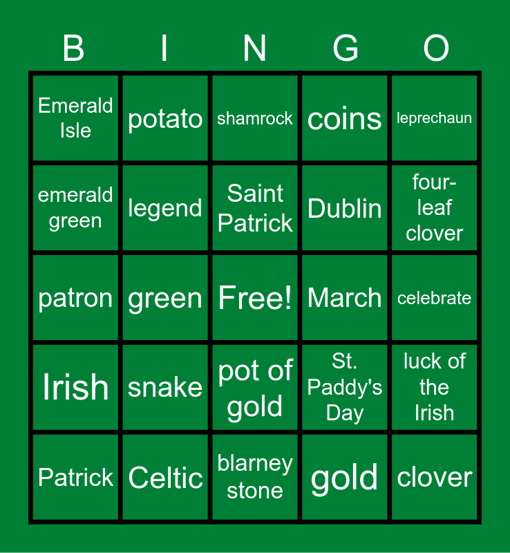 This bingo card has a free space and 32 words: gold, good luck, green, Ireland, Irish, legend, leprechaun, luck of the Irish, potato, rainbow, Saint Patrick, shamrock, lucky, magic, March, mischief, Patrick, patron, pot of gold, snake, St. Paddy's Day, tradition, celebrate, Celtic, clover, coins, Dublin, emerald green, Emerald Isle, blarney stone, fortune and four-leaf clover.