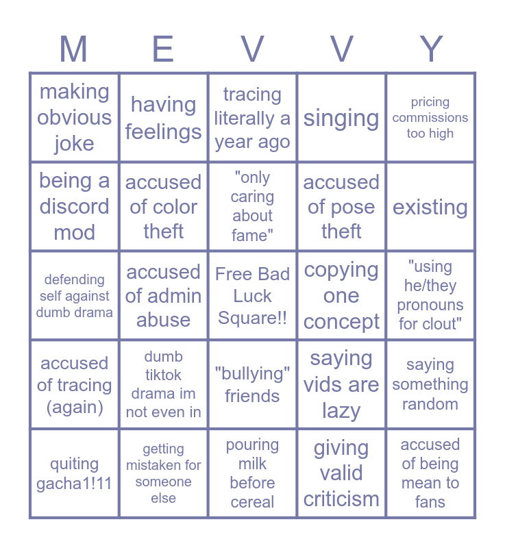 This bingo card has a free space and 29 words: quiting gacha1!11, saying valid opinions, accused of admin abuse, reacting on a message, making obvious joke, tracing literally a year ago, accused of color theft, dumb tiktok drama im not even in, copying one concept, getting mistaken for someone else, "using he/they pronouns for clout", accused of being mean to fans, pouring milk before cereal, giving valid criticism, existing, saying pain too much, "bullying" friends, accused of tracing (again), pricing commissions too high, defending self against dumb drama, saying vids are lazy, accused of stealing own art, accused of pose theft, being a discord mod, singing, having feelings, saying something random, "only caring about fame" and absolutely nothing.