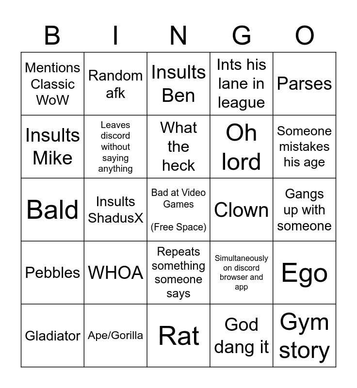 This bingo card has a free space and 24 words: WHOA, Ape/Gorilla, What the heck, Gladiator, Parses, Mentions Classic WoW, Insults Mike, Random afk, Clown, Repeats something someone says, Oh lord, Bald, Simultaneously on discord browser and app, Ego, Leaves discord without saying anything, God dang it, Gangs up with someone, Insults Ben, Someone mistakes his age, Insults ShadusX, Gym story, Pebbles, Ints his lane in league and Rat.