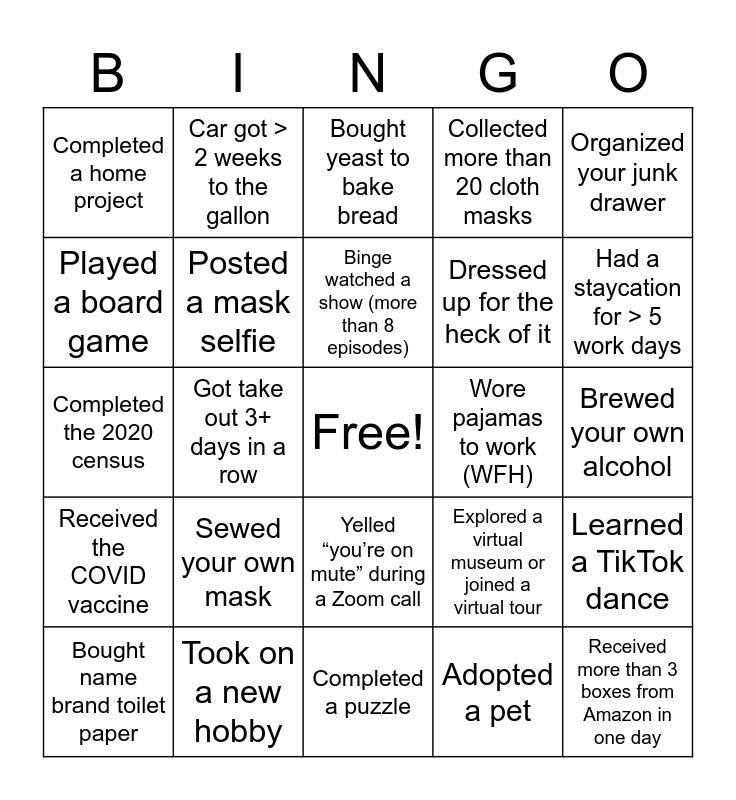 This bingo card has a free space and 25 words: Sewed your own mask, Completed a puzzle, Binge watched a show (more than 8 episodes), Bought name brand toilet paper, Organized your junk drawer, Completed a home project, Played a board game, Car got > 2 weeks to the gallon, Wore pajamas to work (WFH), Yelled “you’re on mute” during a Zoom call, Dressed up for the heck of it, Completed the 2020 census, Explored a virtual museum or joined a virtual tour, Learned a TikTok dance, Posted a mask selfie, Gave someone a hair cut, Brewed your own alcohol, Bought yeast to bake bread, Had a staycation for > 5 work days, Got take out 3+ days in a row, Received more than 3 boxes from Amazon in one day, Took on a new hobby, Received the COVID vaccine, Collected more than 20 cloth masks and Adopted a pet.