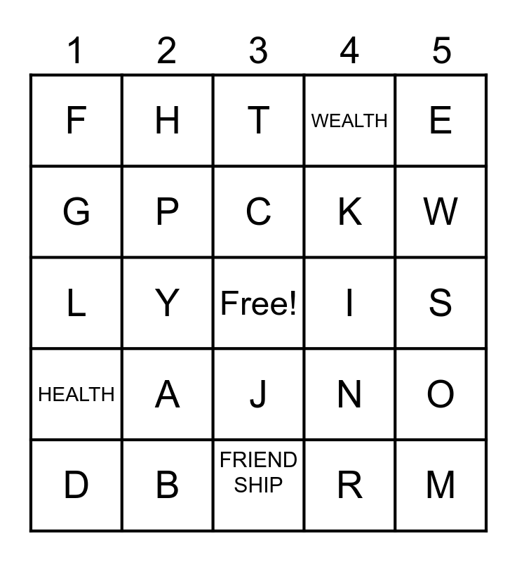 This bingo card has a free space and 24 words: A, B, C, D, E, F, G, H, I, J, K, L, N, O, P, R, S, T, W, Y, M, HEALTH, WEALTH and FRIEND SHIP.