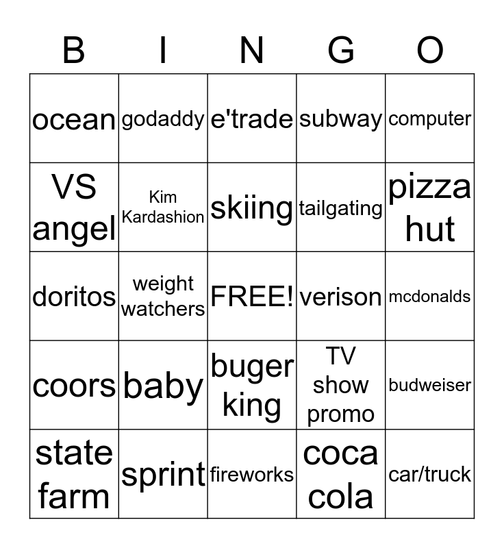 This bingo card has a free space and 24 words: baby, sprint, skiing, state farm, computer, ocean, VS angel, godaddy, verison, buger king, tailgating, doritos, TV show promo, budweiser, Kim Kardashion, coca cola, mcdonalds, e'trade, pizza hut, weight watchers, car/truck, coors, subway and fireworks.