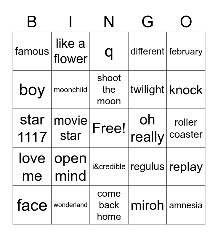 This bingo card has a free space and 24 words: open mind, wonderland, shoot the moon, face, february, famous, boy, like a flower, oh really, i&credible, twilight, star 1117, regulus, replay, moonchild, miroh, roller coaster, q, knock, movie star, amnesia, love me, different and come back home.