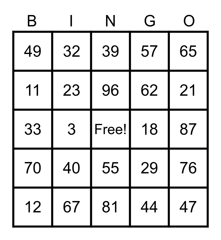 This bingo card has a free space and 24 words: 12, 40, 96, 44, 65, 49, 32, 39, 18, 87, 33, 23, 29, 76, 11, 67, 81, 57, 21, 70, 3, 55, 62 and 47.