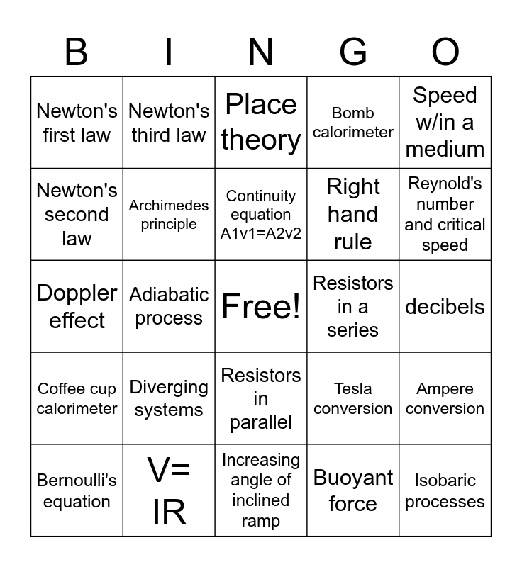 This bingo card has a free space and 24 words: Diverging systems, V= IR, Continuity equation A1v1=A2v2, Bernoulli's equation, Speed w/in a medium, Newton's first law, Newton's second law, Newton's third law, Resistors in a series, Resistors in parallel, Right hand rule, Doppler effect, Tesla conversion, Ampere conversion, Archimedes principle, Buoyant force, decibels, Place theory, Reynold's number and critical speed, Adiabatic process, Isobaric processes, Coffee cup calorimeter, Bomb calorimeter and Increasing angle of inclined ramp.