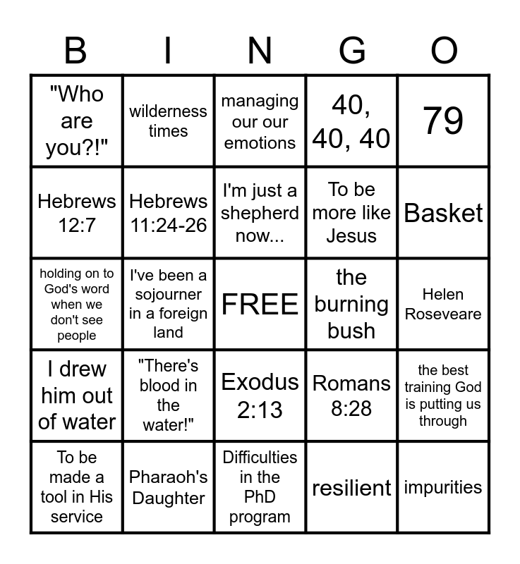 This bingo card has a free space and 24 words: "There's blood in the water!", Pharaoh's Daughter, I'm just a shepherd now..., To be made a tool in His service, 79, "Who are you?!", Hebrews 12:7, wilderness times, the burning bush, Exodus 2:13, To be more like Jesus, holding on to God's word when we don't see people, Romans 8:28, the best training God is putting us through, Hebrews 11:24-26, resilient, Helen Roseveare, managing our our emotions, Basket, I've been a sojourner in a foreign land, impurities, I drew him out of water, 40, 40, 40 and Difficulties in the PhD program.