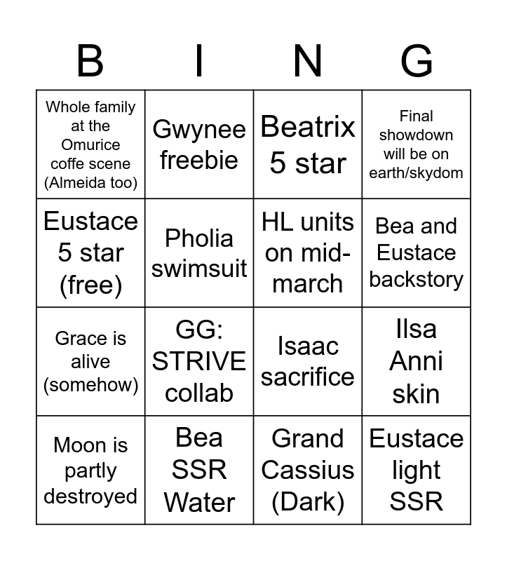 This bingo card has 16 words: Bea SSR Water, Ilsa Anni skin, Beatrix 5 star, Whole family at the Omurice coffe scene (Almeida too), Grace is alive (somehow), Gwynee freebie, Isaac sacrifice, Grand Cassius (Dark), Eustace 5 star (free), Pholia swimsuit, Moon is partly destroyed, Final showdown will be on earth/skydom, GG: STRIVE collab, Bea and Eustace backstory, HL units on mid-march and Eustace light SSR.