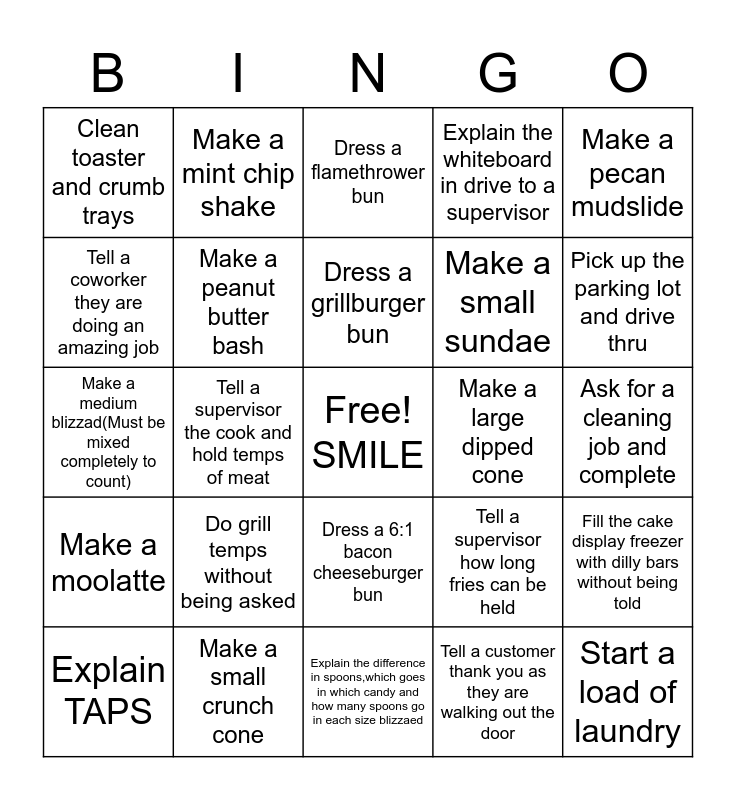 This bingo card has a free space and 24 words: Do grill temps without being asked, Make a small crunch cone, Dress a grillburger bun, Explain TAPS, Make a pecan mudslide, Clean toaster and crumb trays, Tell a coworker they are doing an amazing job, Make a mint chip shake, Make a large dipped cone, Dress a 6:1 bacon cheeseburger bun, Make a small sundae, Make a medium blizzad(Must be mixed completely to count), Tell a supervisor how long fries can be held, Fill the cake display freezer with dilly bars without being told, Make a peanut butter bash, Tell a customer thank you as they are walking out the door, Ask for a cleaning job and complete, Dress a flamethrower bun, Pick up the parking lot and drive thru, Tell a supervisor the cook and hold temps of meat, Start a load of laundry, Make a moolatte, Explain the whiteboard in drive to a supervisor and Explain the difference in spoons,which goes in which candy and how many spoons go in each size blizzaed.