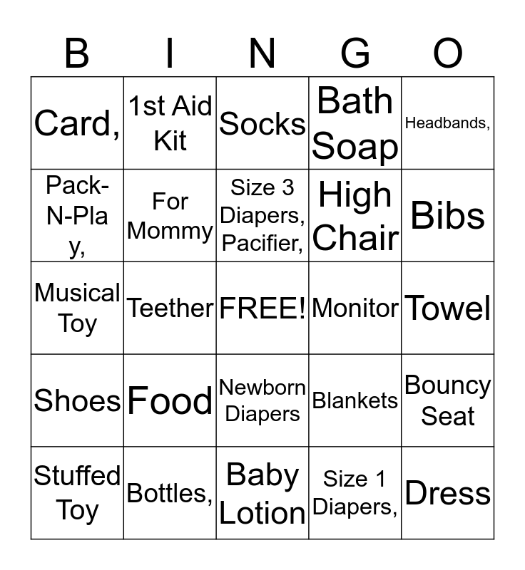 This bingo card has a free space and 26 words: Newborn Diapers, Size 1 Diapers,, Size 3 Diapers, Pacifier,, Bottles,, Headbands,, Card,, Pack-N-Play,, 1st Aid Kit, Towel, Blankets, High Chair, Musical Toy, Bouncy Seat, Stuffed Toy, Teether, Medicine, Bath Soap, Shoes, Socks, Dress, Bibs, Baby Lotion, Monitor, Food, For Mommy and For Daddy.