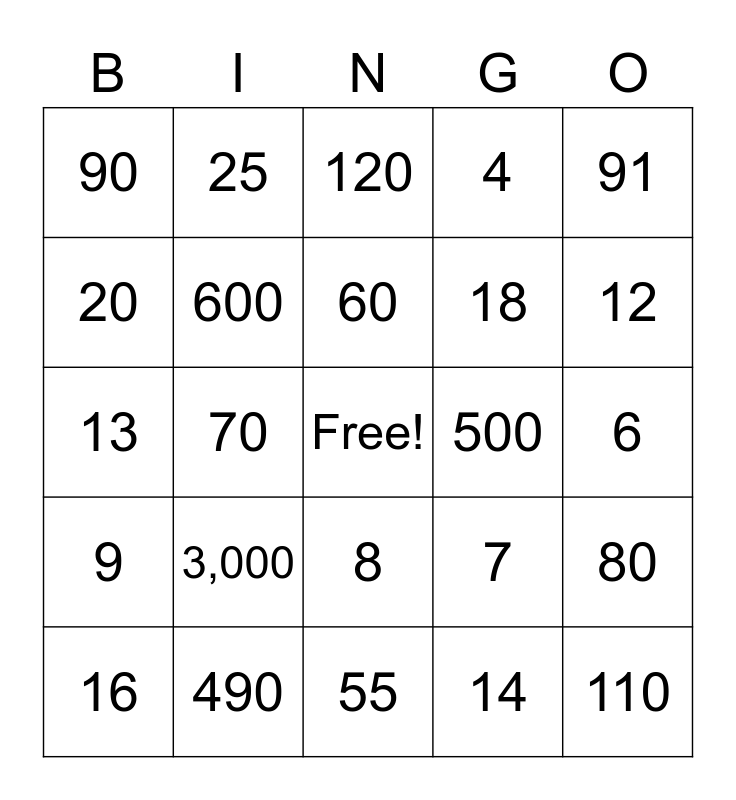 This bingo card has a free space and 30 words: 490, 33, 70, 5, 90, 120, 600, 8, 500, 55, 6, 110, 14, 47, 12, 1,000, 7, 9, 3,000, 91, 13, 30, 25, 18, 20, 4, 80, 16, 60 and 50.