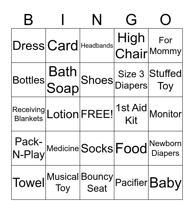 This bingo card has a free space and 28 words: Newborn Diapers, Size 1 Diapers, Size 3 Diapers, Pacifier, Bottles, Headbands, Card, Pack-N-Play, 1st Aid Kit, Towel, Receiving Blankets, High Chair, Musical Toy, Bouncy Seat, Stuffed Toy, Teether, Medicine, Bath Soap, Shoes, Socks, Dress, Bibs, Baby, Lotion, Monitor, Food, For Mommy and For Daddy.