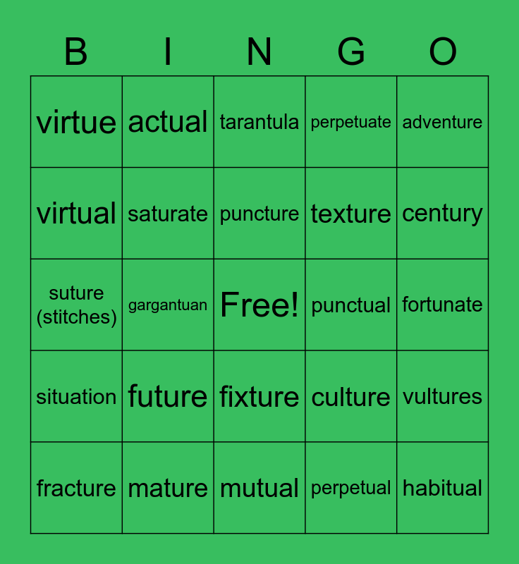 This bingo card has a free space and 24 words: future, mature, puncture, fracture, adventure, virtue, virtual, actual, punctual, fixture, texture, suture (stitches), culture, vultures, saturate, perpetual, fortunate, tarantula, century, gargantuan, habitual, situation, perpetuate and mutual.