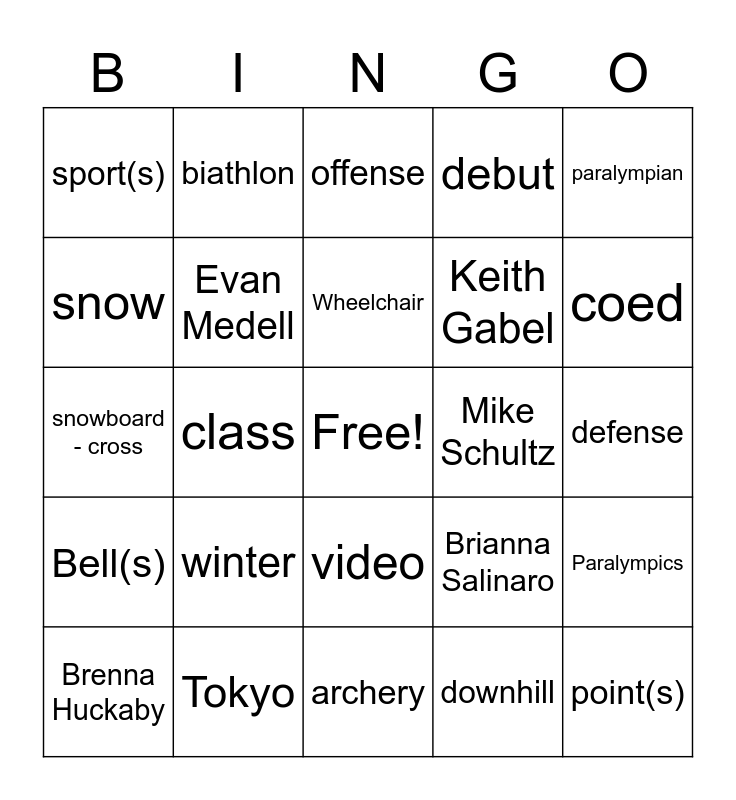 This bingo card has a free space and 36 words: Tahl Leibovitz, Ian Seidenfeld, Jenson Van Emburgh, Evan Medell, Brianna Salinaro, Bell(s), Wheelchair, bounce, paralympian, sit ski(s), class, debut, match(es), Mike Schultz, coed, sport(s), summer, winter, point(s), offense, defense, Paralympics, Tokyo, Brenna Huckaby, archery, biathlon, snowboard - cross, banked slalom, Keith Gabel, snow, court, Rio, downhill, video, freestyle and bank(s).