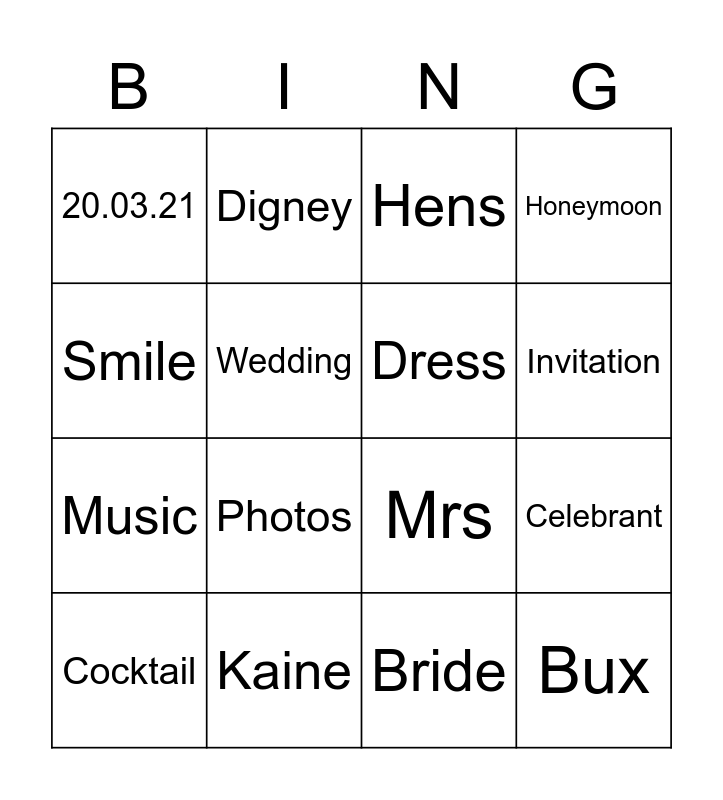 This bingo card has 22 words: Kaine, Brooke, Digney, Ring, Wedding, Dress, 20.03.21, Hens, Mrs, Bux, Music, Honeymoon, Mr, Flowers, Bride, Groom, Celebrant, Cocktail, Photos, Smile, Invitation and R.S.V.P.
