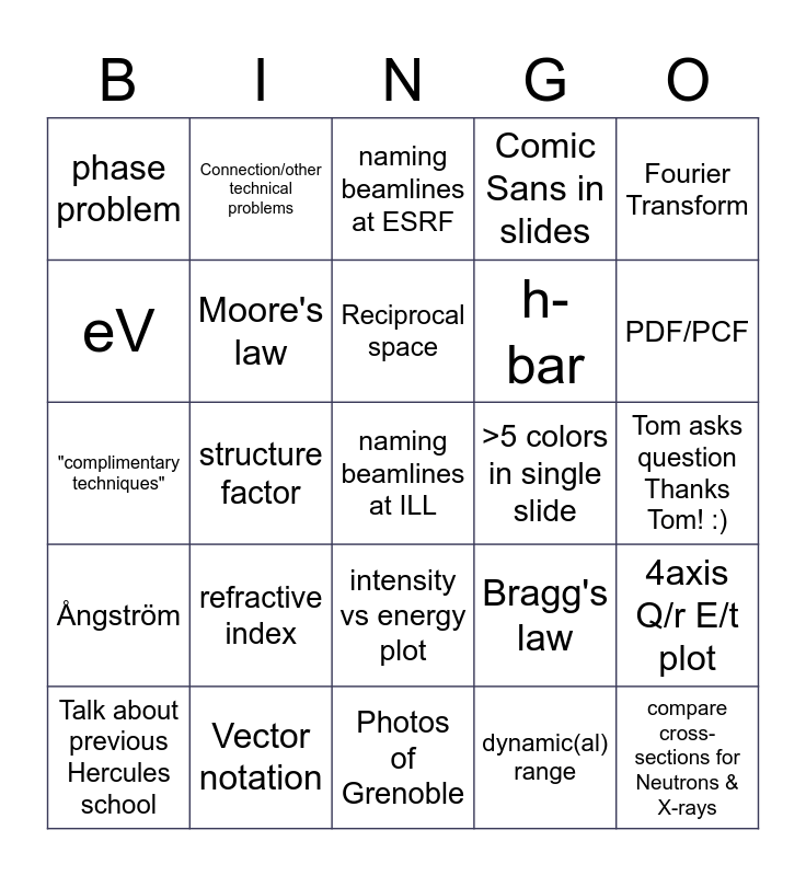 This bingo card has 36 words: Brilliance vs time, >10min overtime, Mrs Röntgen's hand, Moore's law, Bragg's law, Ångström, Reciprocal space, wavelength, Fourier Transform, Form factor, structure factor, Comic Sans in slides, <5 people have their camera on, >5 colors in single slide, PDF/PCF, phase problem, compare cross-sections for Neutrons & X-rays, refractive index, naming beamlines at ILL, naming beamlines at ESRF, Tom asks question Thanks Tom! :), 4axis Q/r E/t plot, Vector notation, Talk about previous Hercules school, Photos of Grenoble, Connection/other technical problems, "complimentary techniques", "Generation", h-bar, eV, Coherent vs. incoherent scattering, Young's diffraction schematic, dynamic(al) range, intensity vs energy plot, log-log-plot and Absorption Edge.