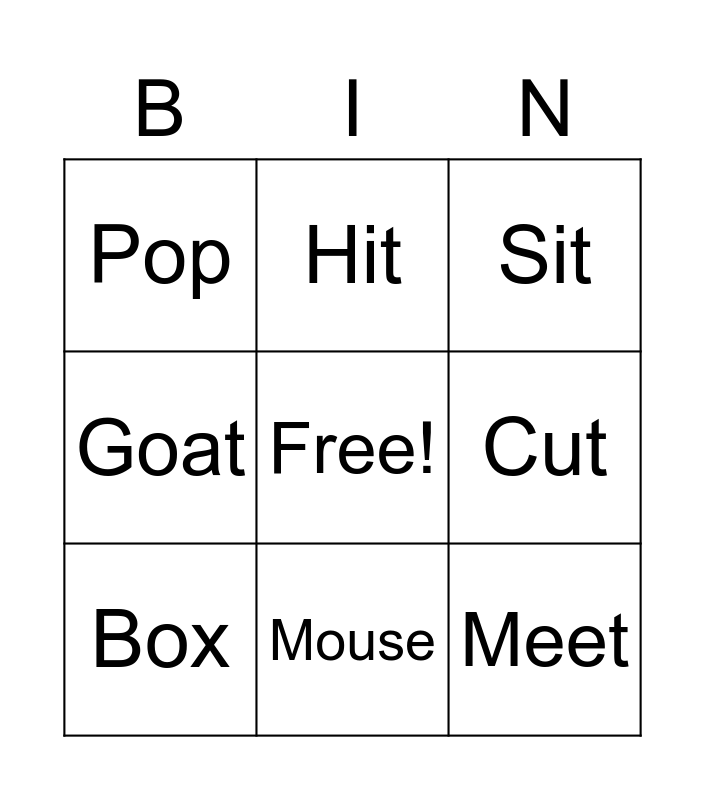 This bingo card has a free space and 22 words: Cat, House, Hit, Hut, Cut, Box, Pop, Sit, Sox, Hot, Mug, Goat, Hat, Ham, Feet, Hop, Rug, Am, Boat, Meet, Mouse and Pot.