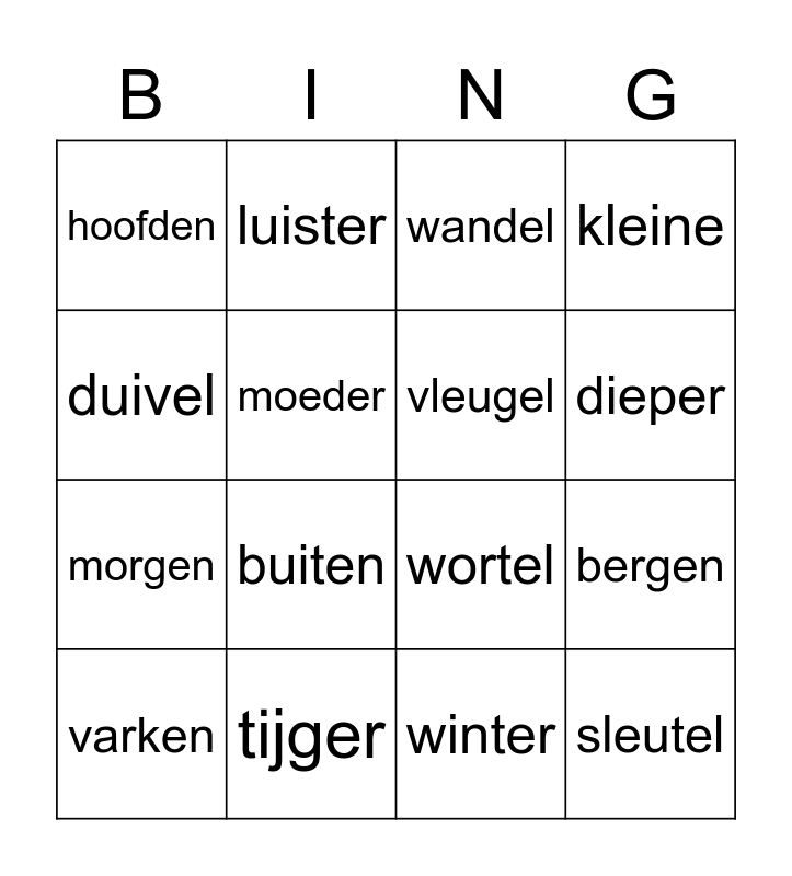 This bingo card has 16 words: tijger, bergen, wandel, hoofden, morgen, luister, wortel, winter, duivel, moeder, varken, kleine, buiten, dieper, vleugel and sleutel.