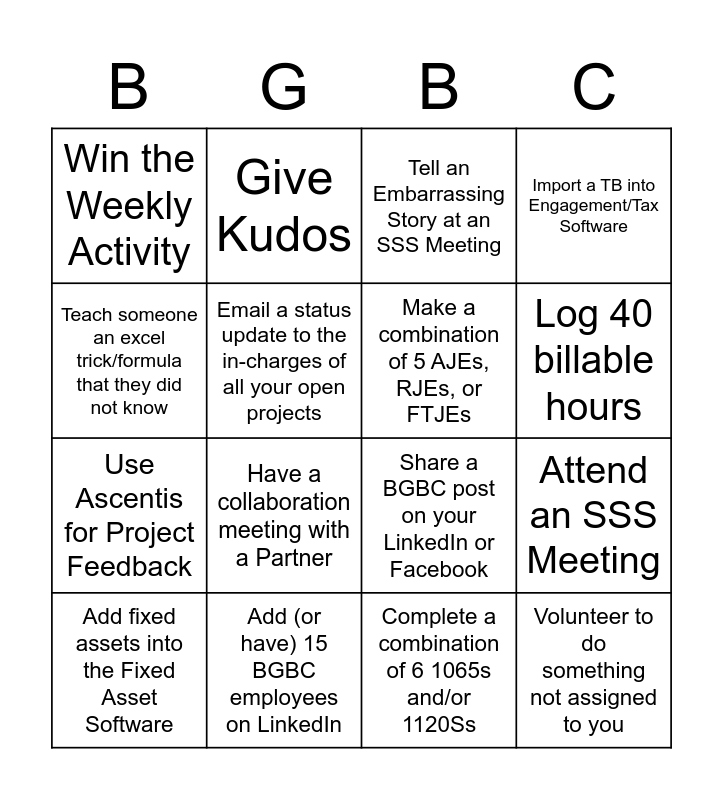 This bingo card has 16 words: Add (or have) 15 BGBC employees on LinkedIn, Attend an SSS Meeting, Tell an Embarrassing Story at an SSS Meeting, Win the Weekly Activity, Use Ascentis for Project Feedback, Give Kudos, Share a BGBC post on your LinkedIn or Facebook, Complete a combination of 6 1065s and/or 1120Ss, Teach someone an excel trick/formula that they did not know, Email a status update to the in-charges of all your open projects, Add fixed assets into the Fixed Asset Software, Import a TB into Engagement/Tax Software, Have a collaboration meeting with a Partner, Log 40 billable hours, Make a combination of 5 AJEs, RJEs, or FTJEs and Volunteer to do something not assigned to you.