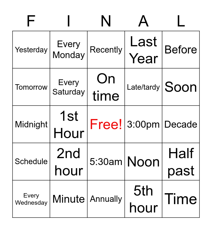 This bingo card has a free space and 24 words: 2nd hour, Minute, On time, Every Wednesday, Before, Yesterday, Tomorrow, Every Monday, 3:00pm, 5:30am, Late/tardy, Midnight, Noon, Half past, Every Saturday, 5th hour, Decade, Recently, Soon, 1st Hour, Time, Schedule, Last Year and Annually.