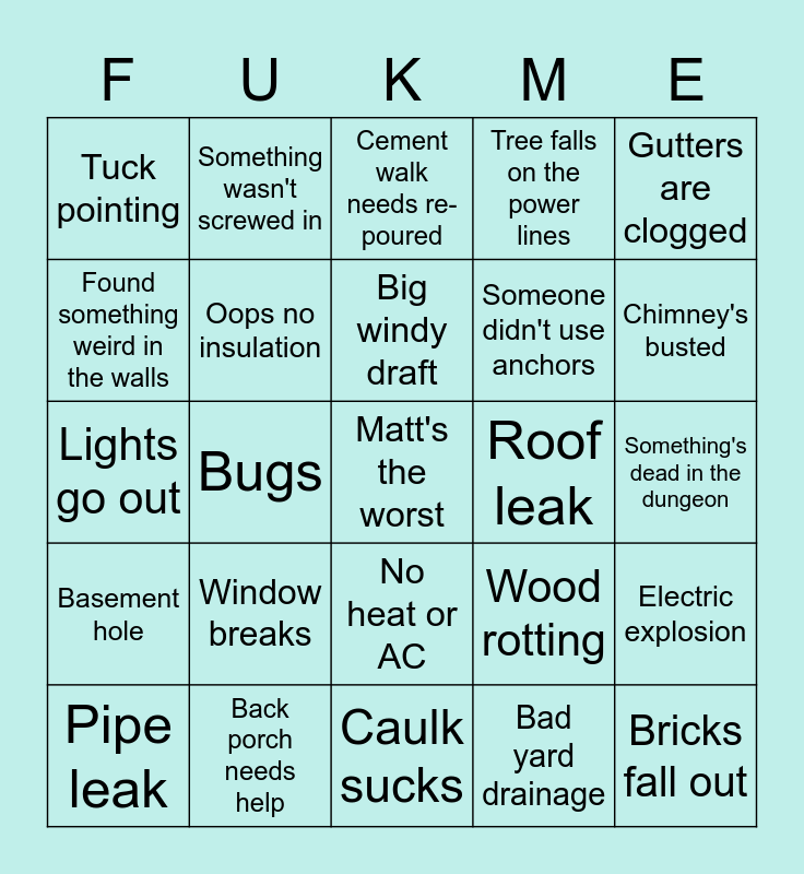 This bingo card has a free space and 34 words: Fire, Bad yard drainage, Water heater breaks, Busted toilet, Basement hole, Oops no insulation, Gutters are clogged, Pipe leak, Something wasn't screwed in, Mold, Big windy draft, Cement walk needs re-poured, Water's too hard and chunky, Siding needs help, Roof leak, Chimney's busted, Back porch needs help, Lights go out, Window breaks, Wood rotting, No heat or AC, Mice, Tuck pointing, Something's dead in the dungeon, Caulk sucks, Bricks fall out, Tree falls on the power lines, Need a sump pump, Someone didn't use anchors, Found something weird in the walls, Surprise left angle, Bugs, Electric explosion and Garbage in the ceiling.