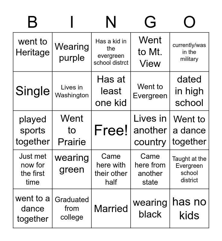 This bingo card has a free space and 25 words: wearing green, Married, Has at least one kid, went to a dance together, currently/was in the military, went to Heritage, Single, Wearing purple, Lives in another country, Came here with their other half, Went to Evergreen, played sports together, Came here from another state, Taught at the Evergreen school district, Lives in Washington, Wearing black, Went to a dance together, Has a kid in the evergreen school distrct, dated in high school, Went to Prairie, has no kids, Graduated from college, Just met now for the first time, Went to Mt. View and wearing black.