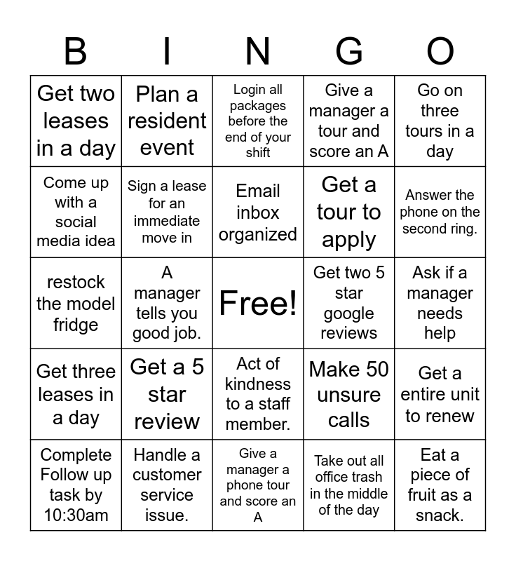 This bingo card has a free space and 24 words: Get a 5 star review, Handle a customer service issue., Email inbox organized, Complete Follow up task by 10:30am, Go on three tours in a day, Get two leases in a day, Come up with a social media idea, Plan a resident event, Get two 5 star google reviews, Act of kindness to a staff member., Get a tour to apply, restock the model fridge, Make 50 unsure calls, Get a entire unit to renew, Sign a lease for an immediate move in, Take out all office trash in the middle of the day, Ask if a manager needs help, Login all packages before the end of your shift, Answer the phone on the second ring., A manager tells you good job., Eat a piece of fruit as a snack., Get three leases in a day, Give a manager a tour and score an A and Give a manager a phone tour and score an A.