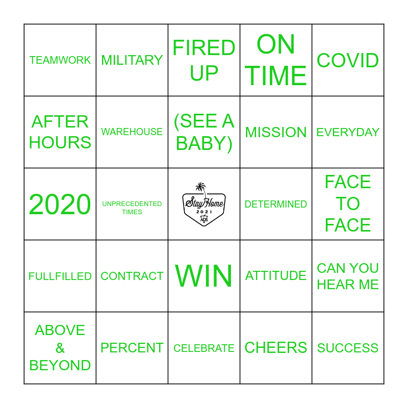 This bingo card has a free space and 29 words: ABOVE & BEYOND, THIS PERSON, UNPRECEDENTED TIMES, DRIVE, TEAMWORK, FIRED UP, WAREHOUSE, CONTRACT, DETERMINED, PERCENT, FACE TO FACE, SUCCESS, CELEBRATE, CHEERS, EVERYDAY, GEAR, WIN, FULLFILLED, COVID, 2020, ATTITUDE, HARD WORK, MISSION, AFTER HOURS, ON TIME, MILITARY, CAN YOU HEAR ME, (SEE A BABY) and MEN AND WOMEN IN UNIFORM.
