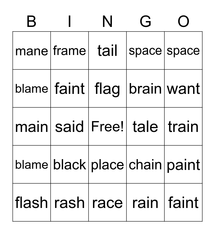 This bingo card has a free space and 24 words: black, rash, flag, flash, space, mane, blame, frame, tale, place, brain, main, chain, paint, faint, rain, train, tail, want, said, faint, blame, space and race.