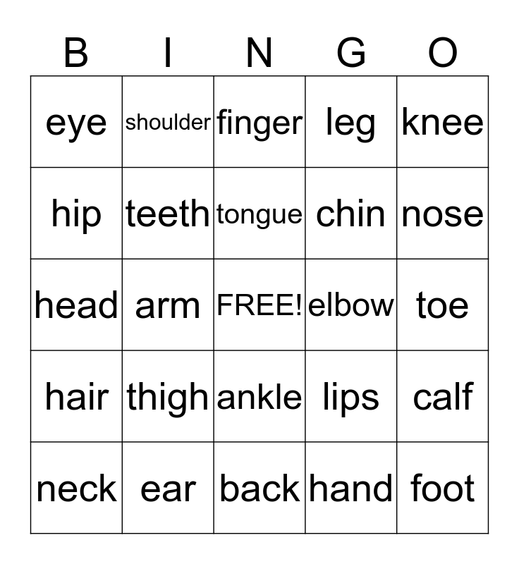 This bingo card has a free space and 24 words: thigh, ear, tongue, neck, knee, eye, hip, shoulder, elbow, ankle, chin, head, lips, calf, teeth, hand, toe, finger, nose, arm, foot, hair, leg and back.