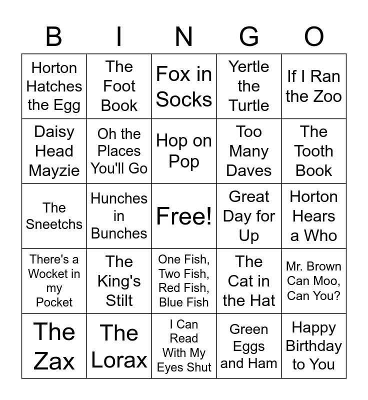 This bingo card has a free space and 24 words: The Zax, The King's Stilt, Hop on Pop, Green Eggs and Ham, If I Ran the Zoo, Horton Hatches the Egg, The Foot Book, Fox in Socks, Great Day for Up, Horton Hears a Who, The Sneetchs, Oh the Places You'll Go, The Cat in the Hat, Mr. Brown Can Moo, Can You?, Daisy Head Mayzie, The Lorax, I Can Read With My Eyes Shut, Yertle the Turtle, The Tooth Book, There's a Wocket in my Pocket, Hunches in Bunches, One Fish, Two Fish, Red Fish, Blue Fish, Too Many Daves and Happy Birthday to You.