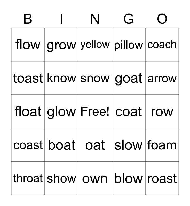 This bingo card has a free space and 24 words: boat, show, snow, throat, coach, flow, toast, grow, coat, oat, goat, float, slow, foam, know, blow, row, yellow, arrow, glow, roast, coast, pillow and own.