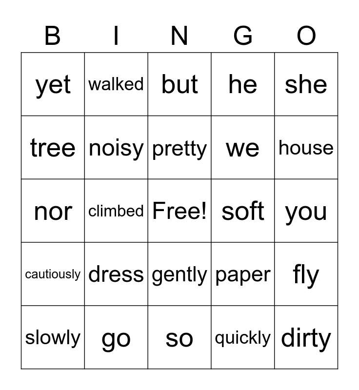 This bingo card has a free space and 24 words: dress, go, pretty, slowly, she, yet, tree, walked, soft, gently, we, nor, paper, fly, noisy, quickly, you, but, house, climbed, dirty, cautiously, he and so.