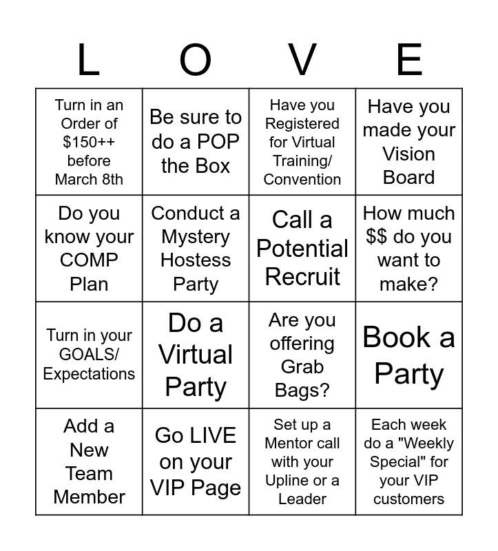 This bingo card has 20 words: Book a Party, FAST Start Program - Keep track, Have you Registered for Virtual Training/ Convention, Policy & Procedures, Add a New Team Member, Do you know your COMP Plan, Go LIVE on your VIP Page, Turn in an Order of $150++ before March 8th, Turn in your GOALS/ Expectations, Be sure to do a POP the Box, Do a Virtual Party, Are you offering Grab Bags?, Conduct a Mystery Hostess Party, Each week do a "Weekly Special" for your VIP customers, Call a Potential Recruit, Offer items for $17, How much $$ do you want to make?, Have you made your Vision Board, Set up a Mentor call with your Upline or a Leader and Attend LWU.