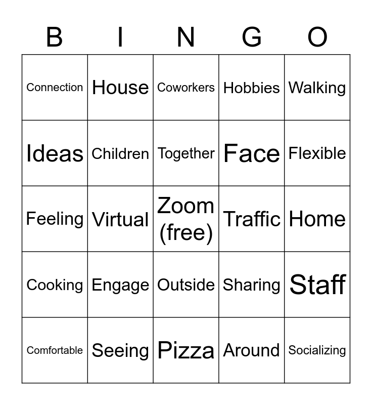 This bingo card has a free space and 100 words: Working, Time, Home, Commuting, Lunch, Flexibility, People, Coffee, Team, Meeting, Family, Conversation, Strain, Seeing, Breaks, Hours, Face, Distractions, Life, Colleagues, Walk, Sitting, People, Chat, Talk, Traffic, Walking, Sharing, Schedule, Interruption, Virtual, Connection, Care, Balance, Around, Together, Staff, Social, Personal, Meals, New, Impromptu, Feeling, Separation, Flexible, Coworkers, Connect, Screen, Morning, Pizza, Interaction, Fun, Collaboration, Room, Online, Informal, Everyone, Dinner, Break, Hobbies, Alone, Productive, Teamwork, Culture, Celebration, Exercise, Sleep, Wellness, Tired, Zoom, Games, Engage, Purpose, Relax, Leader, Share, Laughing, Ideas, Early, Brainstorming, Space, Socializing, Scenery, Outside, Human, House, Environment, Empathy, Clothing, Cooking, Waiting, Parking, Learning, Comfortable, Children, Casual, Activities, Weekend, Moving and Relationship.