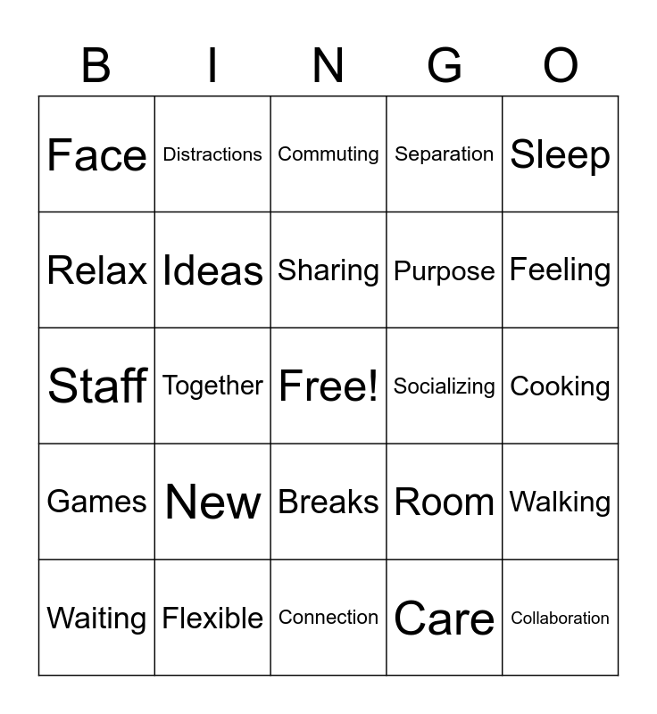 This bingo card has a free space and 99 words: Working, Time, Home, Commuting, Lunch, Flexibility, Coffee, Team, Meeting, Family, Conversation, Strain, Seeing, Breaks, Hours, Face, Distractions, Life, Colleagues, Walk, Sitting, People, Chat, Talk, Traffic, Walking, Sharing, Schedule, Interruption, Virtual, Connection, Care, Balance, Around, Together, Staff, Social, Personal, Meals, New, Impromptu, Feeling, Separation, Flexible, Coworkers, Connect, Screen, Morning, Pizza, Interaction, Fun, Collaboration, Room, Online, Informal, Everyone, Dinner, Break, Hobbies, Alone, Productive, Teamwork, Culture, Celebration, Exercise, Sleep, Wellness, Tired, Zoom, Games, Engage, Purpose, Relax, Leader, Share, Laughing, Ideas, Early, Brainstorming, Space, Socializing, Scenery, Outside, Human, House, Environment, Empathy, Clothing, Cooking, Waiting, Parking, Learning, Comfortable, Children, Casual, Activities, Weekend, Moving and Relationship.