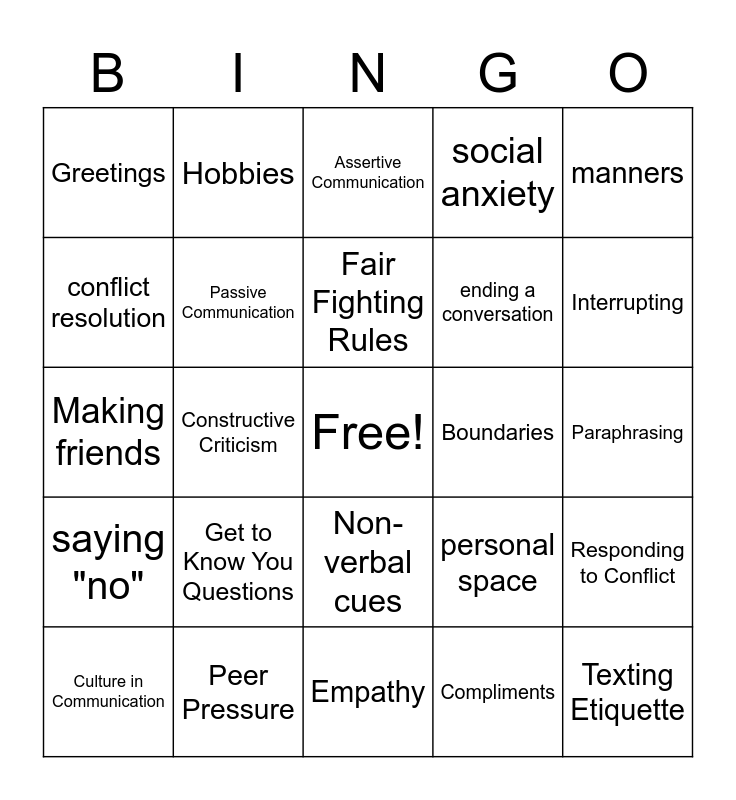 This bingo card has a free space and 29 words: Culture in Communication, Teamwork, Constructive Criticism, Awkward Moment, Greetings, Assertive Communication, Passive Communication, Get to Know You Questions, Boundaries, Peer Pressure, Paraphrasing, Texting Etiquette, Empathy, Compliments, Interrupting, Respectfully Disagreeing, Non-verbal cues, saying "no", manners, Making friends, personal space, starting a conversation, ending a conversation, conflict resolution, social anxiety, Hobbies, Responding to Conflict, Fair Fighting Rules and Saying Sorry.