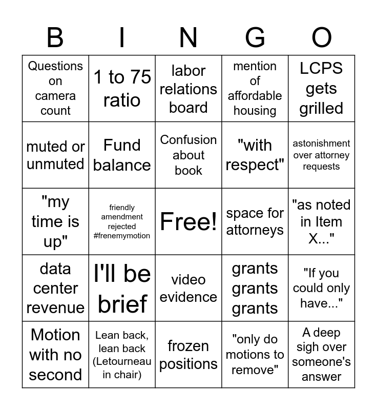 This bingo card has a free space and 24 words: I'll be brief, Lean back, lean back (Letourneau in chair), Confusion about book, Motion with no second, LCPS gets grilled, Questions on camera count, muted or unmuted, 1 to 75 ratio, space for attorneys, video evidence, "with respect", "my time is up", grants grants grants, "If you could only have...", Fund balance, "only do motions to remove", "as noted in Item X...", labor relations board, astonishment over attorney requests, friendly amendment rejected #frenemymotion, A deep sigh over someone's answer, data center revenue, mention of affordable housing and frozen positions.