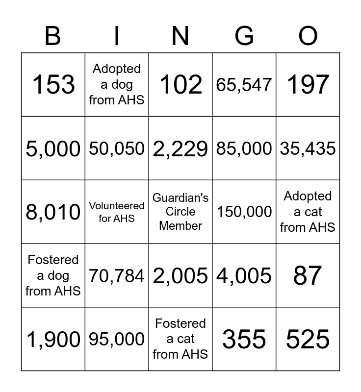 This bingo card has a free space and 24 words: 70,784, 95,000, 2,229, 1,900, 197, 153, 5,000, Adopted a dog from AHS, 150,000, 2,005, 85,000, 8,010, 4,005, 87, 50,050, 355, Adopted a cat from AHS, 102, 35,435, Volunteered for AHS, 525, Fostered a dog from AHS, 65,547 and Fostered a cat from AHS.