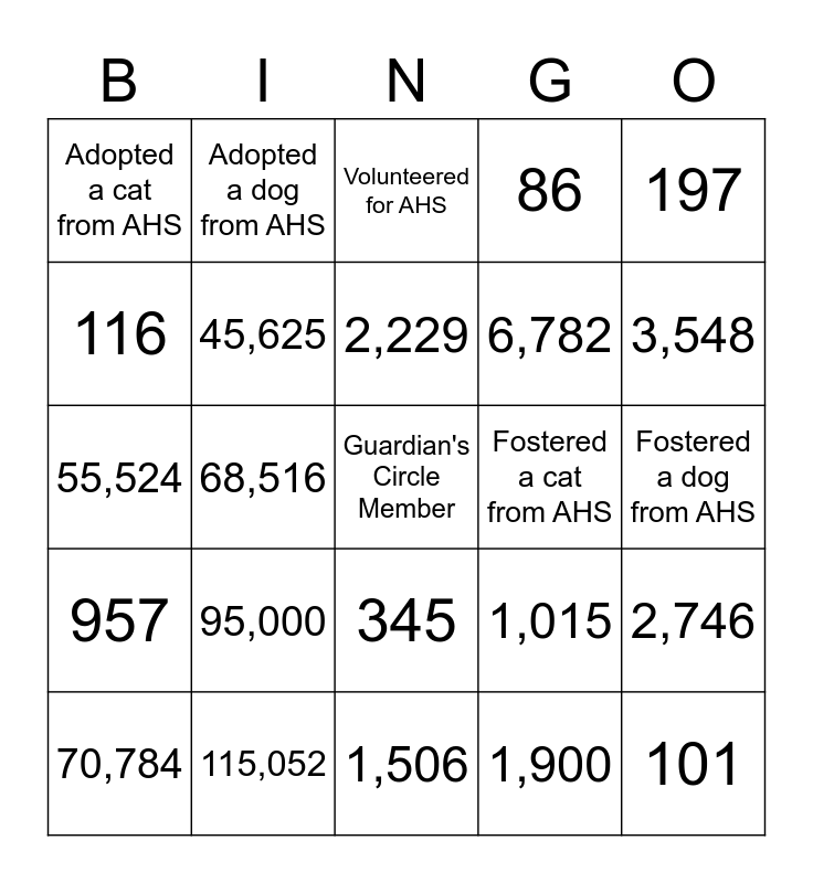 This bingo card has a free space and 24 words: 70,784, 95,000, 2,229, 1,900, 197, Adopted a cat from AHS, Adopted a dog from AHS, Volunteered for AHS, Fostered a cat from AHS, Fostered a dog from AHS, 55,524, 45,625, 1,015, 2,746, 116, 115,052, 1,506, 86, 3,548, 957, 68,516, 345, 6,782 and 101.