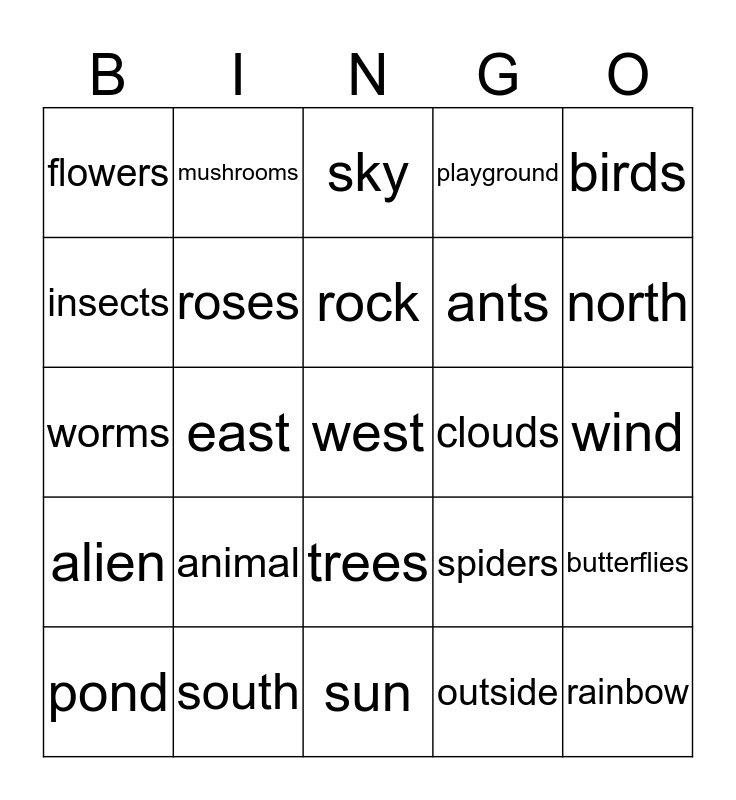 This bingo card has 25 words: animal, sun, rock, pond, birds, flowers, insects, mushrooms, clouds, trees, ants, worms, spiders, butterflies, roses, rainbow, wind, sky, north, east, west, south, alien, playground and outside.