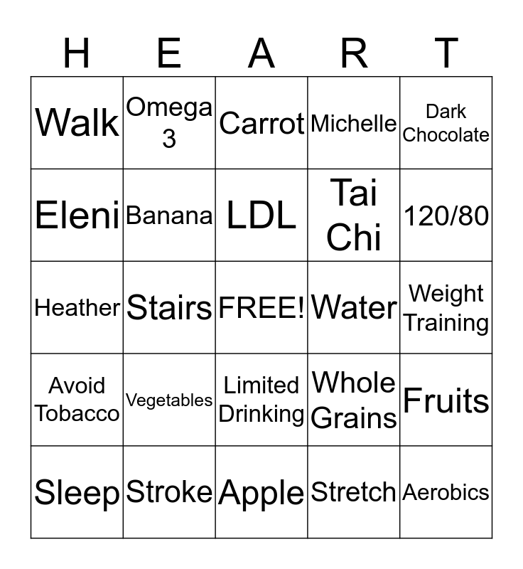 This bingo card has a free space and 31 words: Apple, Yoga, Stairs, Run, Walk, Carrot, Banana, Whole Grains, Water, Stretch, Weight Training, Aerobics, Low Stress, Healthy weight, 120/80, Exercise, Fruits, Vegetables, Avoid Tobacco, Limited Drinking, Dark Chocolate, Red Wine, Sleep, Omega 3, Tai Chi, Eleni, Michelle, Heather, Stroke, LDL and HDL.