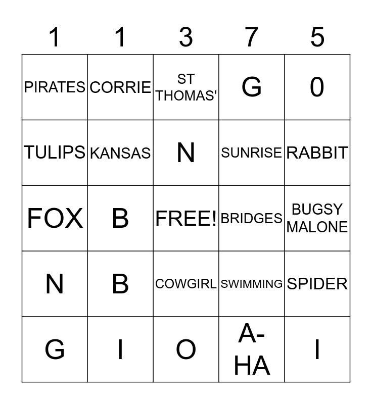 This bingo card has a free space and 24 words: B, I, N, G, 0, PIRATES, TULIPS, CORRIE, BRIDGES, COWGIRL, SUNRISE, FOX, SWIMMING, SPIDER, KANSAS, A-HA, BUGSY MALONE, ST THOMAS', RABBIT, B, I, N, G and O.