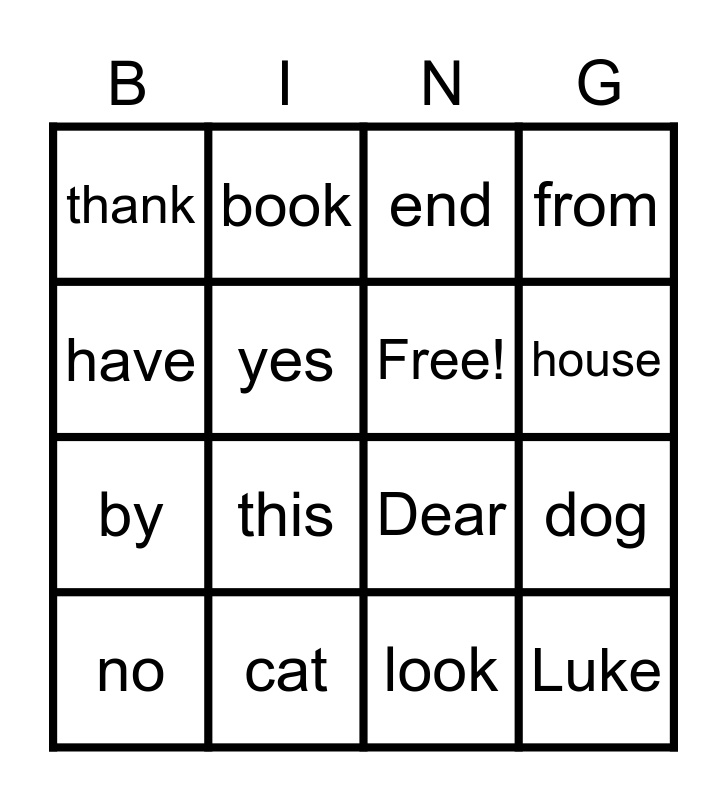 This bingo card has 16 words: cat, dog, end, thank, by, book, Dear, look, have, yes, no, from, this, house, Free! and Luke.