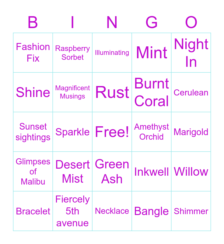 This bingo card has a free space and 29 words: Bracelet, Simply Santa Fe, Sparkle, Ultimate Gray, Fashion Fix, Illuminating, Magnificent Musings, Desert Mist, Amethyst Orchid, Fiercely 5th avenue, Marigold, Shimmer, Necklace, Bangle, Cerulean, Ring, Green Ash, Glimpses of Malibu, Night In, Sunset sightings, Inkwell, French Blue, Burnt Coral, Shine, Mint, Raspberry Sorbet, Willow, Rust and $5.