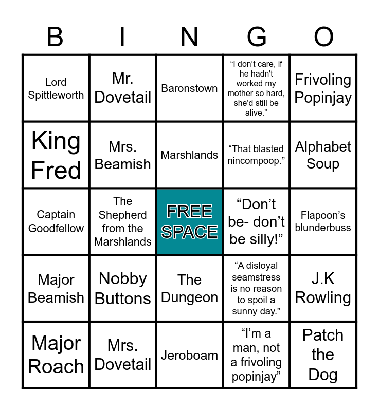 This bingo card has a free space and 50 words: Daisy, Mrs. Dovetail, Cornucopia, “I’m a man, not a frivoling popinjay”, J.K Rowling, Bert, Mr. Dovetail, Chouxville, “That blasted nincompoop.”, Diseased Sheep, King Fred, Mrs. Beamish, “A disloyal seamstress is no reason to spoil a sunny day.”, Patch the Dog, Lord Flapoon, Chief Advisor Herringbone, Baronstown, “Don’t be- don’t be silly!”, Hopes of Heaven, Lord Spittleworth, Nobby Buttons, Jeroboam, “I don’t care, if he hadn't worked my mother so hard, she'd still be alive.”, Alphabet Soup, The Ickabog, Maid Hetty, Marshlands, “Don’t let her get away with it, Butterball!", Frivoling Popinjay, Major Beamish, King Porfirio of neighboring Pluritania, City-Within-The-City, “The ground is treacherous. Stay still, don’t attempt to move!”, King Richard the Righteous, Lady Eslanda, Marshlanders, The Courtyard where the children play and fight, “A marshteazle, sire. Them’s bald ratlike things what lives in the marsh. Not bad in pies if ye don’t mind the tails.”, The Day of Petition, Captain Goodfellow, Royal Guard, Guard’s Room, “The King would have told us if anything had happened to Daddy.”, The King’s lost sword, Major Roach, The Shepherd from the Marshlands, The Dungeon, “It makes no difference to me whether a man is a cheesemaker or a king, so long as he behaves with honor.”, Flapoon’s blunderbuss and Kurdsburg.